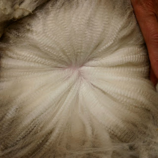Sist tog vi fram fällen från Eros, fantastiska mängder ull! Här var vi noga, vi plockade o plockade. Plockade ut små fiberprover från vänster, mitten och bak för att få mått på hur lång fibern över hela fällen ska vara. Och sen var det bara att plocka vidare.. Och vilken ull! Den är så jämn i kvalitet och längd! Och en glans som är otrolig.
